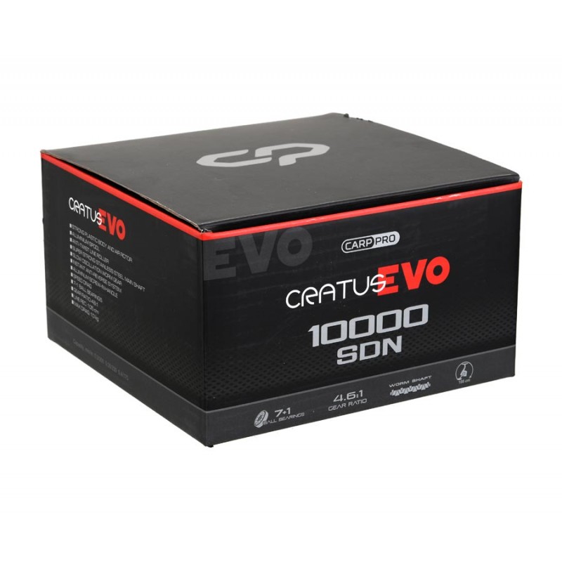Carp Pro Cratus Evo 10000 SDN – новинка 2024 года, мощная и надёжная карповая катушка нового поколения для ловли трофейной рыбы на больших дистанциях. Модель Cratus Evo 10000 SDN будет великолепным дополнением к одноименной серии карповых удилищ Carp Pro Cratus Evo. Она изготовлена в жёстком корпусе из высокопрочного пластика, оснащена мощным тяговым механизмом с червячной передачей и быстрым фрикционным тормозом Speed Drag. Вместительная алюминиевая шпуля геометрии Long Cast с конической формой буртика способствует снижению трения лески и заметно повышает дальность заброса. Качественная укладка лески виток к витку достигается использованием бесконечного винта с мелким шагом (Slow Oscillation Worm Gear). Под шпулей Carp Pro Cratus Evo 10000 SDN расположено специальное пластиковое кольцо, предотвращающее попадание лески под шпулю и наматывание её на ось. К достоинствам новых катушек Cratus Evo 10000 SDN стоит также отнести алюминиевую ручку, которая вкручивается в главную пару, минимизируя люфты в этом узле, сверхпрочную ось из нержавеющей стали, ролик лесоукладывателя с системой Anti-Twist, исключающий перекручивание лески, мгновенный стопор обратного хода, повышенное количество лески, наматываемой за один оборот ручки, круглую металлическую клипсу, а также быстрый фрикцион, который позволяет мгновенно менять тормозное усилие и отличается высокой стабильностью работы. Катушка Carp Pro Cratus Evo 10000 SDN – это надёжный рабочий инструмент для охотников на трофейную рыбу, который выполнен в стильном черном цвете с красными элементами дизайна и идеально сочетается с одноименной серией карповых удилищ Cratus Evo!Характеристики катушки Carp Pro Cratus Evo 10000 SDN: