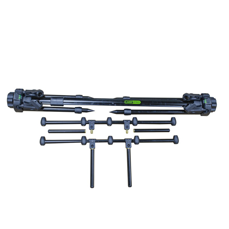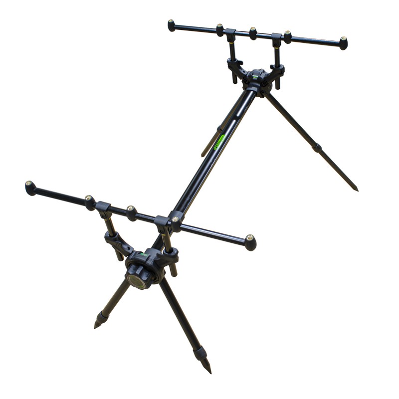 Ключевые преимущества этой модели — компактные размеры в сложенном состоянии, а также возможность его хранения и транспортировки в тубусе. Жесткий тубус изготовлен из плотной, синтетической ткани, сверху закрывается на молнию. Все элементы род-пода — как пластиковые, так и металлические — выполнены из легких и качественных материалов. Общая длина подставки для удилищ составляет около 85 см в сложенном положении и достигает 135 см при максимальном растяжении. Модель оснащена телескопическими ножками, длина которых составляет 24 см для одной пары и 33 см для другой. Ножки можно удлинить еще на 17 и 20 см соответственно. Ширина бузбара составляет 58 см, а его высота может регулироваться в пределах 15 см. Дополнительный плюс — род-под оснащен двумя пузырьковыми уровнями, которые расположены по бокам изделия. Такой род-под рассчитан на 3 и 4 удилища и, благодаря быстрозажимным винтам и защелкам, весьма удобен на карповой сессии.