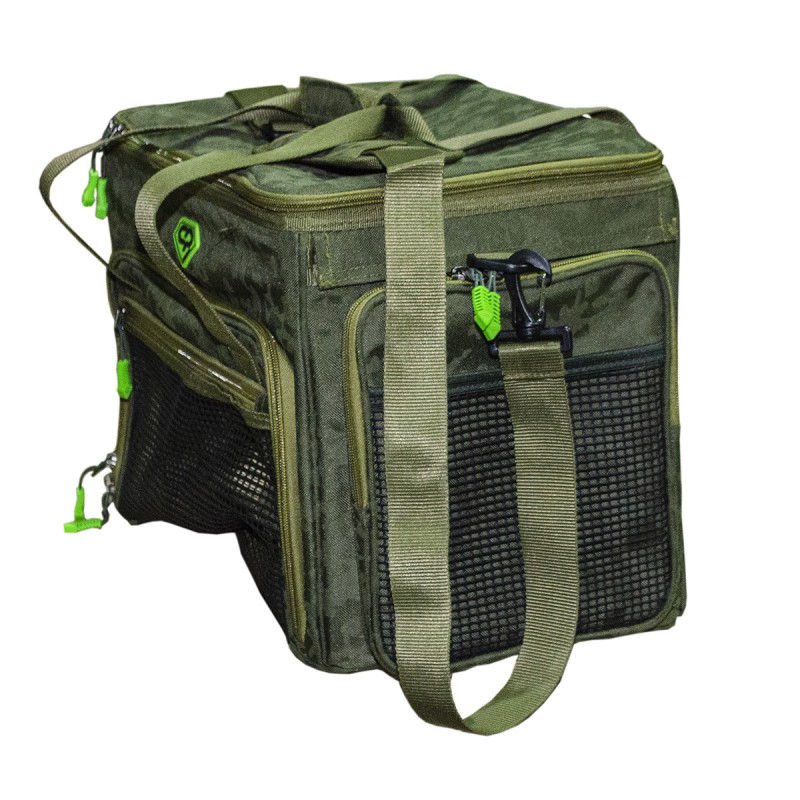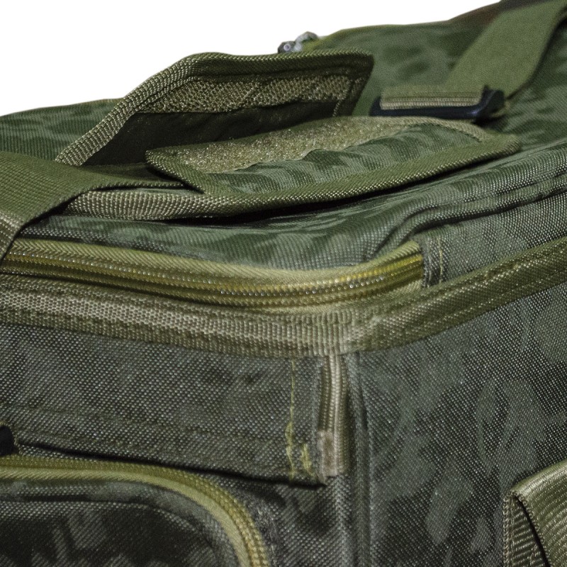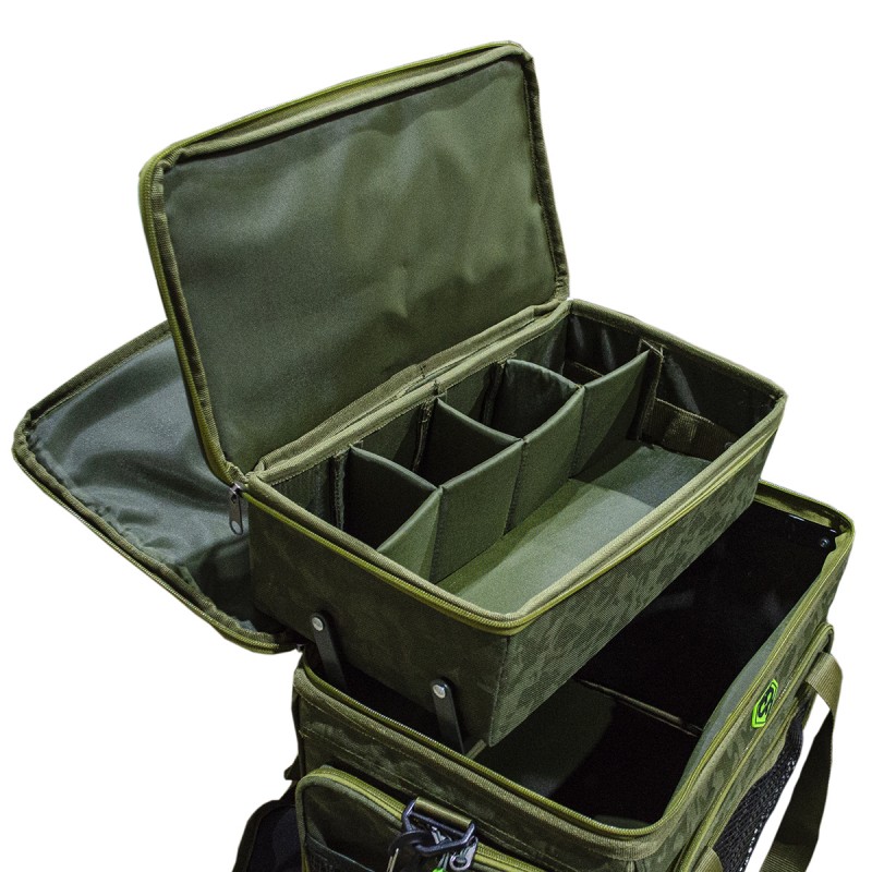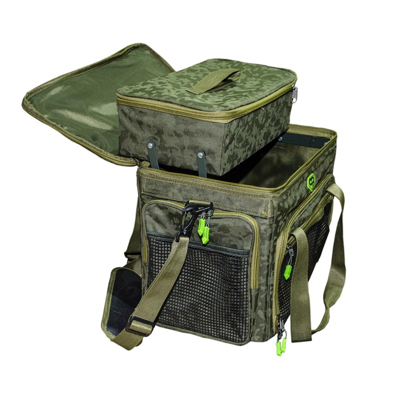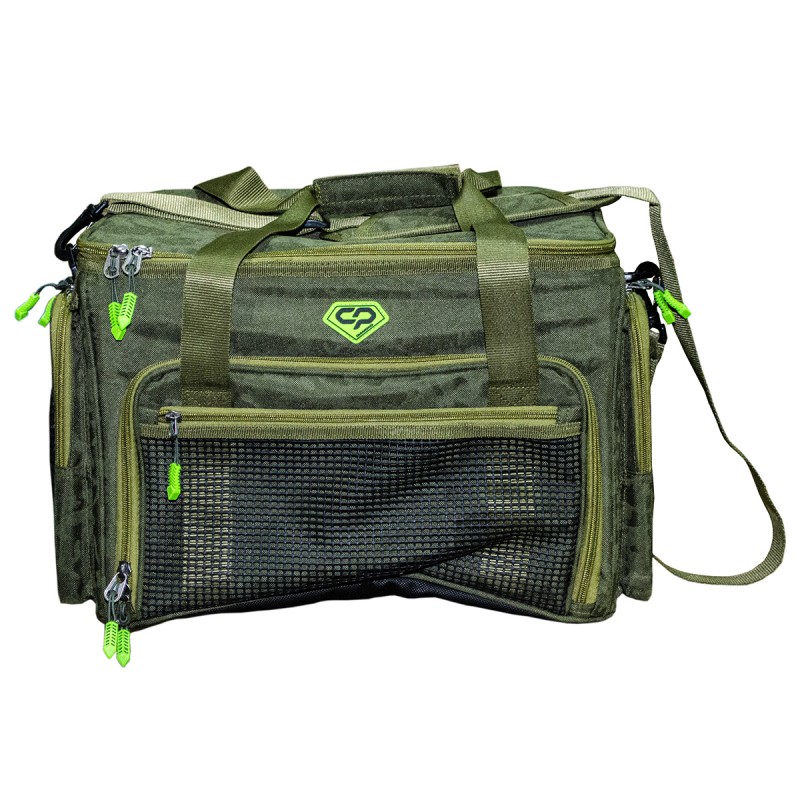Carp Pro Diamond Multi Bag – мультифункциональная сумка с металлической жесткой рамой. Предназначена для транспортировки и хранения рыболовного снаряжения и аксессуаров. Изготовлена из фирменного влагостойкого камуфлированного материала Oxford 650D. Diamond Multi Bag имеет жесткие стенки, на которых смонтирован механизм выдвижного внутреннего бокса на металлических кронштейнах. Этот жесткий бокс разделен на несколько многофункциональных съемных отделений на липучке и предназначен для хранения разнообразнейшего снаряжения: запасных шпуль, прикормок, банок с дипами и насадками, маркерных поплавков, сподовых ракет и т.д. и т.п. Кроме того бокс может использоваться в качестве монтажного столика. Доступ к вместительному внутреннему отделению осуществляется через фронтальный клапан на двусторонней молнии. Здесь прекрасно разместятся карповые катушки, коробки и боксы со снастями, прочее объемное снаряжение. На клапане предусмотрен накладной прозрачный сеточный карман. Вместительные боковые карманы также оборудованы прозрачными сеточными кармашками. На крышках и карманах установлены надежные молнии. Благодаря жесткости конструкции, сумка отлично держит форму и защищает содержимое от повреждений. Для удобства транспортировки предусмотрены прочные ручки и регулируемый наплечный ремень с мягкой накладкой.