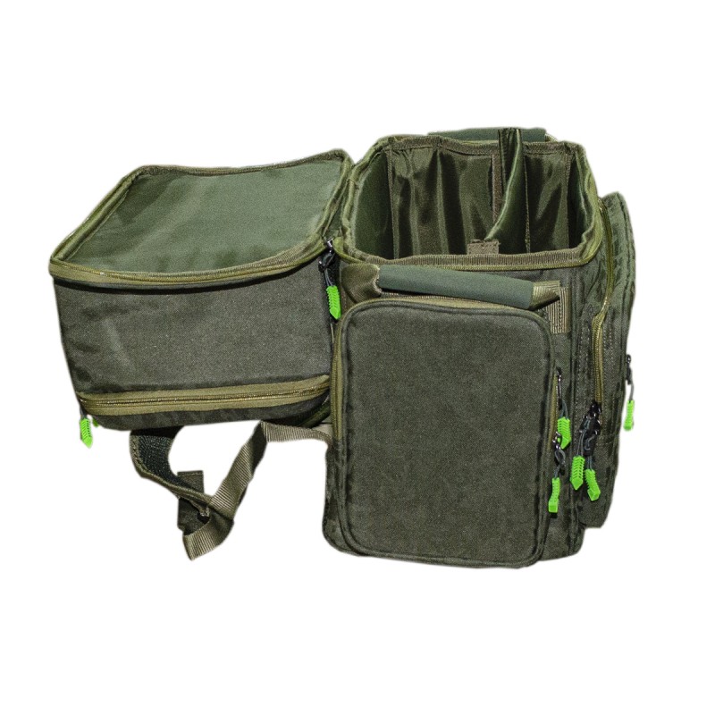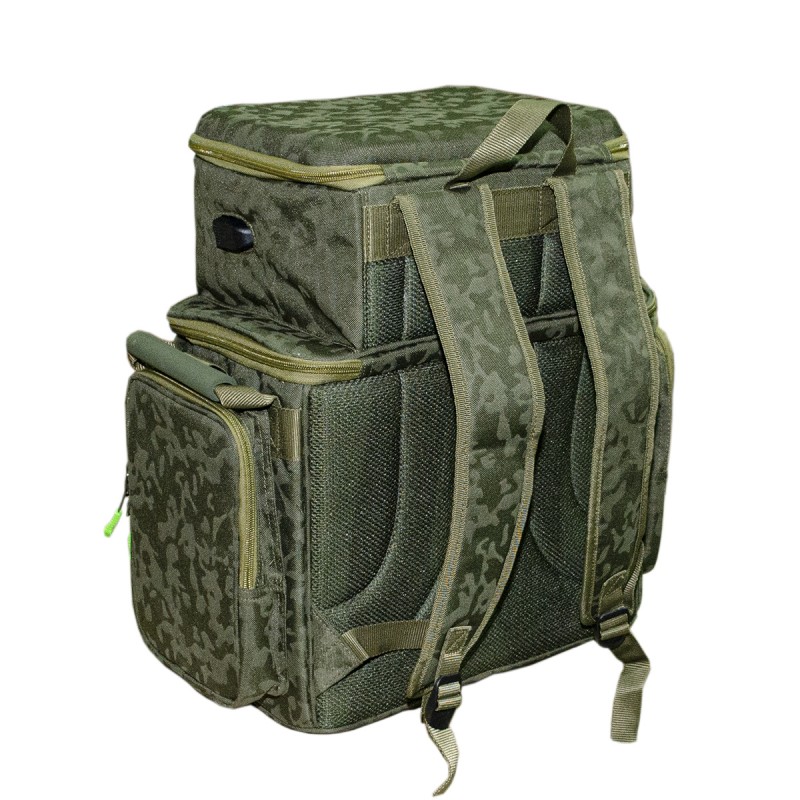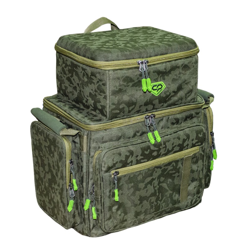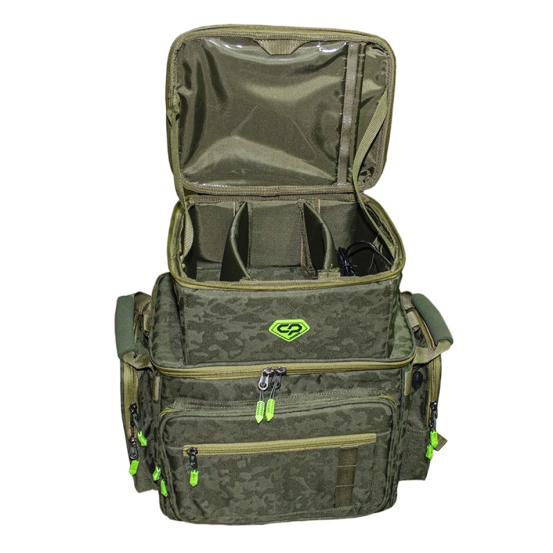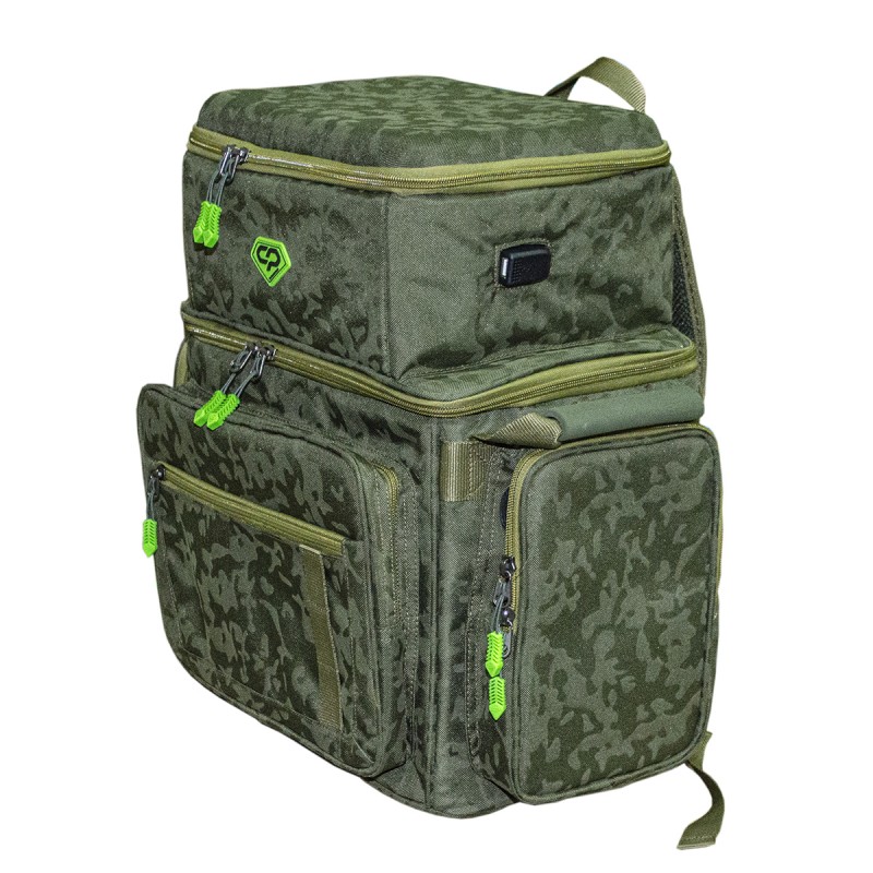 Carp Pro Diamond Ruckback – вместительная сумка-рюкзак для рыболовного снаряжения, вещей и аксессуаров. Изготовлена из фирменного влагостойкого камуфлированного материала Oxford 650D. Оснащена непромокаемым днищем из ПВХ. Большое основное отделение закрывается на двустороннюю молнию, имеет съемную жесткую перегородку на липучках и способно вместить все необходимое как для коротких рыболовных сессий, так и для длительных выездов. Сверху на клапане Diamond Ruckback расположен бокс со съемными перегородками на 3 отделения, предназначенный для всевозможных мелочей, электронных гаджетов и прочего снаряжения. Бокс имеет встроенный шнур для Power Bank с внешним разъемом USB для подзарядки мобильных телефонов и прочих устройств. В закрытом состоянии может использоваться как монтажный столик. Кроме того рюкзак оборудован вместительным фронтальным карманом и двумя боковыми на молниях, где удобно разместятся небольшие коробочки с терминальными снастями и аксессуарами. Для небольших пакетиков и инструментов предусмотрен плоский накладной кармашек на молнии, а для карабинов и ретриверов – прочные петли. Мягкая вентилируемая спинка, ручки для переноски с накладками из EVA и две регулируемые широкие лямки обеспечивают максимальное удобство при транспортировке CarpPro Diamond Ruckback.