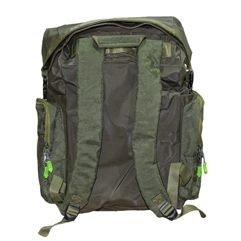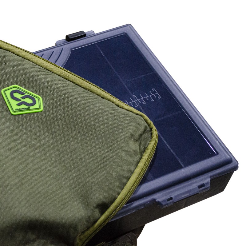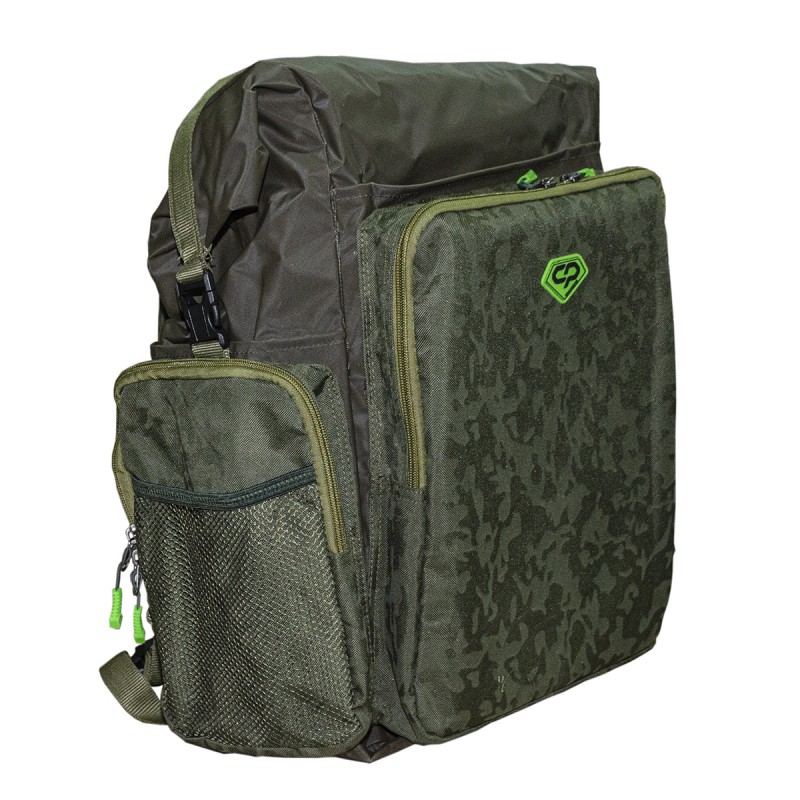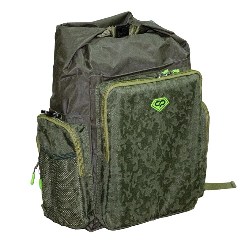 Водозащищенный рюкзак-сумка Carp Pro Diamond Waterproof Rucksack, выполненный из камуфлированного материала Oxford 650D и полностью водонепроницаемой ткани с ПВХ-покрытием и герметичными швами, пригодится в тех случаях, когда сохранность вещей и снаряжения от воды выходит на первый план. В полностью непромокаемое и достаточно большое главное отделение с легкостью вмещаются коробки, небольшие сумочки со снастями, одежда и прочая экипировка. Закрывается отделение наподобие гермомешка: две гибкие пластины на горловине складываются вместе, на них наматывается сама горловина, после чего пластины сгибаются и фиксируются в таком положении защелкой-фастекс, не давая горловине размотаться и открыться. Большой фронтальный карман сумки-рюкзака Diamond Waterproof Rucksack укомплектован пластиковой коробкой для монтажей и аксессуаров. Два боковых кармана для аксессуаров также достаточно вместительны и оснащены надежными молниями. Кроме того по бокам рюкзака есть два небольших открытых ПВХ-кармана для непромокаемой мелочевки – грузил, кормушек и т.п. Спинка Waterproof Rucksack оборудована мягкими вставками, покрытыми сетчатой тканью, которые способствуют равномерному распределению давления. Рюкзак имеет удобную ручку для переноски и мягкие регулируемые лямки.