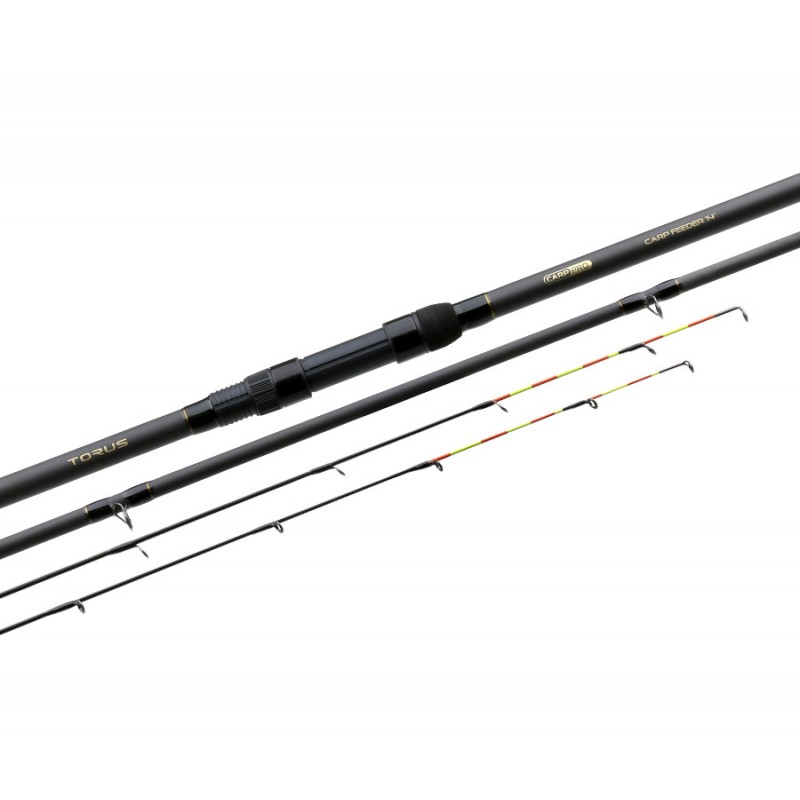 Carp Pro Torus Carp Feeder — серия удилищ, предназначенных для фидерной ловли карпа. Бланки среднего строя (Moderate Fast) из карбона FWC 5.0 отличаются солидным запасом прочности, что будет в полной мере востребовано при вываживании крупного экземпляра. При этом они характеризуются небольшим, как для своей мощности, диаметром. Модели оснащены разнесенными рукоятями из синтетического материала.Пропускные кольца и тюльпан со вставками из твердой керамики имеют рамы противозахлестной конструкции. Удилища комплектуются двумя карбоновыми вершинами номиналом 3, 5 oz. Яркие, флуоресцентные цвета — желтый и оранжевый — делают вершины хорошо заметными на любом фоне и при любой освещенности, что помогает лучше отслеживать поклевки. Кроме своего прямого назначения, удилища могут использоваться для ловли белой рыбы на реках — там, где необходимы тяжелые кормушки.
