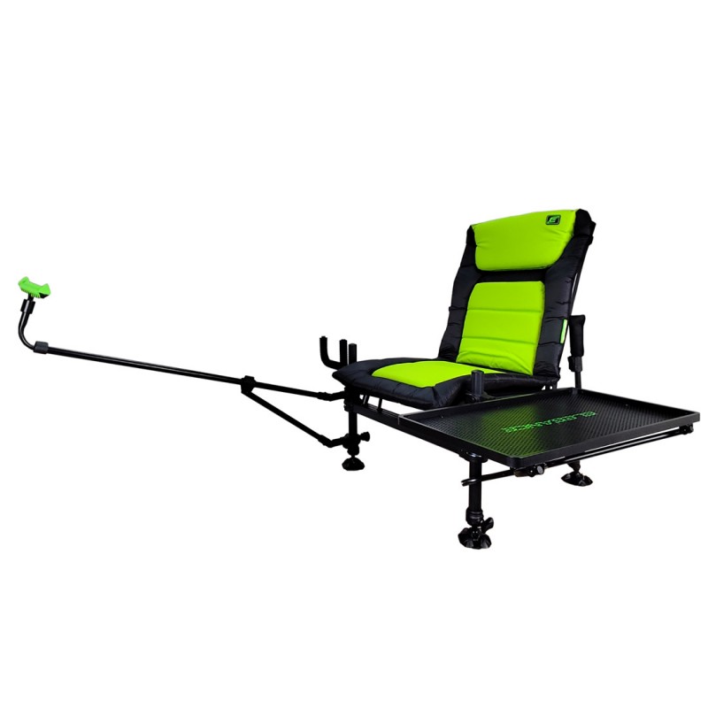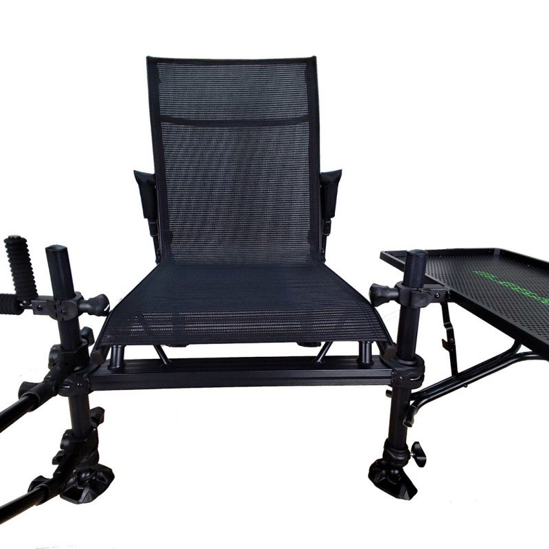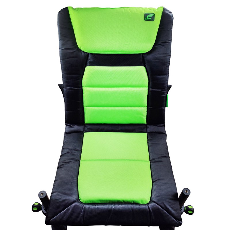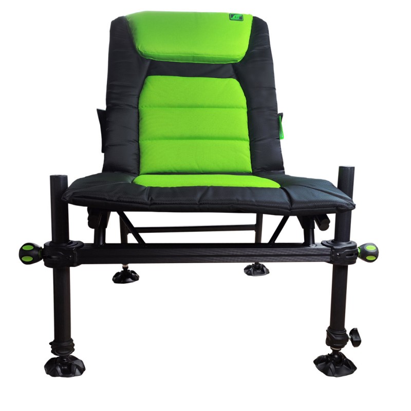 ELEGANCE Method Feeder Chair, лёгкое и очень удобное кресло с прочной конструкцией из металла. Оно оснащено четырьмя телескопическими ножками, позволяющими выставлять кресло ровно на любой поверхности. Каждая ножка имеет широкую пятку, предотвращающую заглубление в сыпучих грунтах. Диаметр передних ножек 36 мм, что позволяет установить множество различных обвесов, что делает рыбалку комфортной! Сверху передних ножек имеется резьба 3/8 дюйма (скрыта под пластиковыми заглушками), что так же расширяет возможности различных обвесов.
