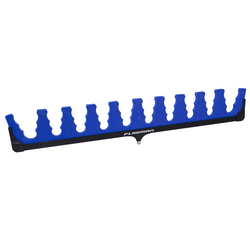 Гребенка Flagman на 10 удилищ. Предназначена для хранения запасных удилищ и топ-китов на рыбалке. Выполнена на алюминиевой раме из мягкого пористого материала EVA, предохраняющего бланки удилищ от царапин. Оснащена стандартным резьбовым соединением для крепления. Каждая ячейка рассчитана на три разных по толщине бланка, которые надежно фиксируются в гребенке. Длина: 60 см.