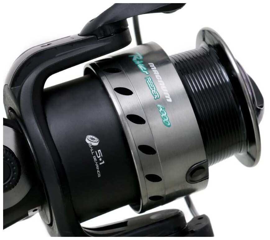 Magnum River Feeder – доступная, но в то же время надежная фидерная катушка, обладающая достойными тяговыми характеристиками. Переднефрикционная схема, а также ротор и корпус, выполненные из прочного пластика, делают MagnumRiver Feeder достаточно легкой и компактной. В катушке установлен сбалансированный механизм на пяти высококачественных нержавеющих шарикоподшипниках. Плавная регулировка фрикциона позволяет выставить тормозное усилие с высокой точностью. Низкопрофильная алюминиевая шпуля с геометрией Long Cast имеет удлиненную форму и коническую поверхность намотки, что существенно увеличивает дальность заброса. Форма ролика лесоукладывателя с системой Anti-Twist препятствует перекручиванию лески, а сверхтвердое напыление позволяет использовать любые шнуры. Превосходная динамическая балансировка облегченного ротора делает комфортной даже очень быструю подмотку. Magnum RiverFeeder оборудована надежной алюминиевой ручкой, ее обрезиненная рукоять удобно ложится в руку.