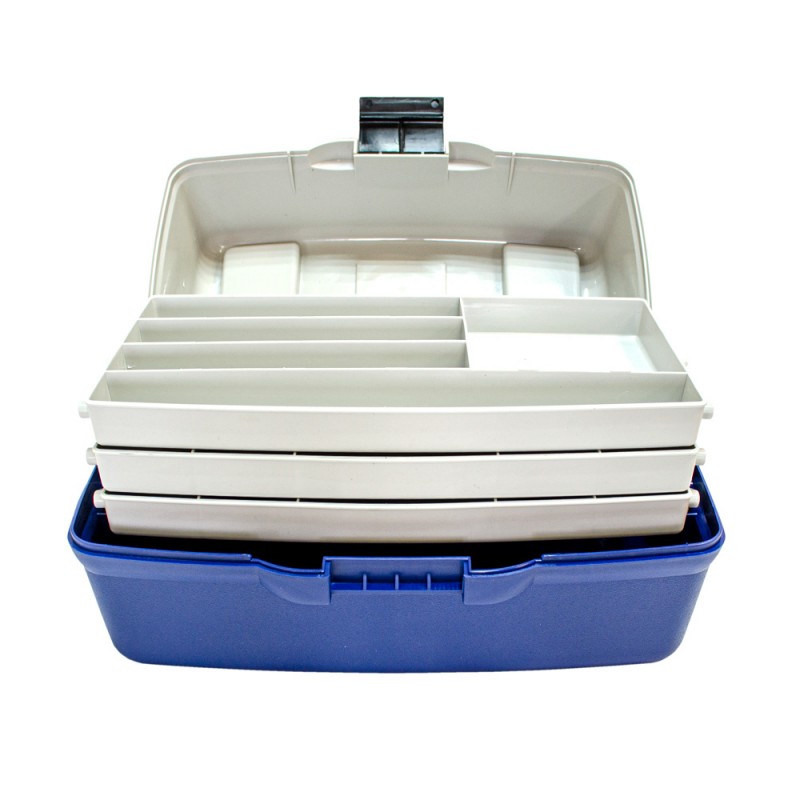 Трёхполочный ящик для рыболовных снастей. Изготовлен из полипропилена, устойчив к воздействию масел, растворителей и силиконов. <br>