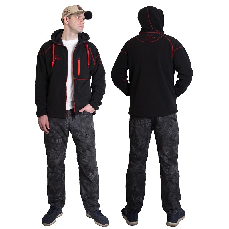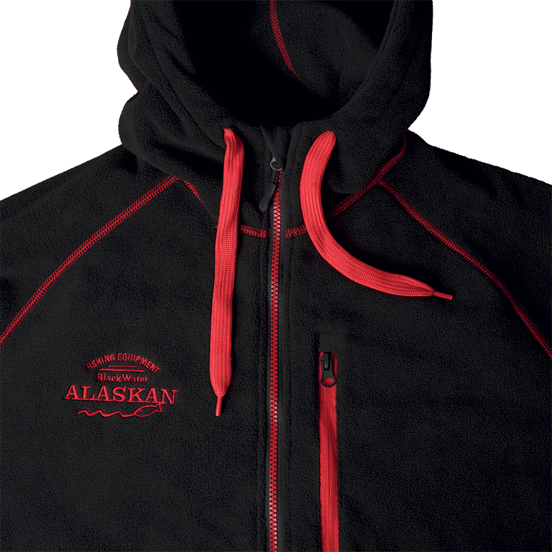 Флисовая куртка с капюшоном (худи) Alaskan Black Water выполнена из поларфлиса плотностью 400 г/м2. Куртка предназначена для использования в качестве второго утепляющего слоя одежды. Флисовые материалы известны своей хорошей гигроскопичностью и способностью удерживать тепло тела за счет своей структуры. Куртка сложного анатомического кроя с центральной молнией имеет один большой нагрудный и два боковых кармана. Левый рукав декорирован вышивкой, на груди размещен логотип Alaskan. Куртка снабжена анатомическим капюшоном с кулиской. Сзади под капюшоном нанесена вышивка логотипа. Низ куртки имеет регулируемую кулиску. Куртка рекомендована для использования на рыбалке, охоте, а также для активного отдыха в любое время года.\r\rОсобенности:\r\r• Анатомический крой\r• Хорошая гигроскопичность\r• Отличная теплозащита\r• Всесезонность\r• Капюшон\r• Плотность 400 г/м2\r• 100% полиэстер.