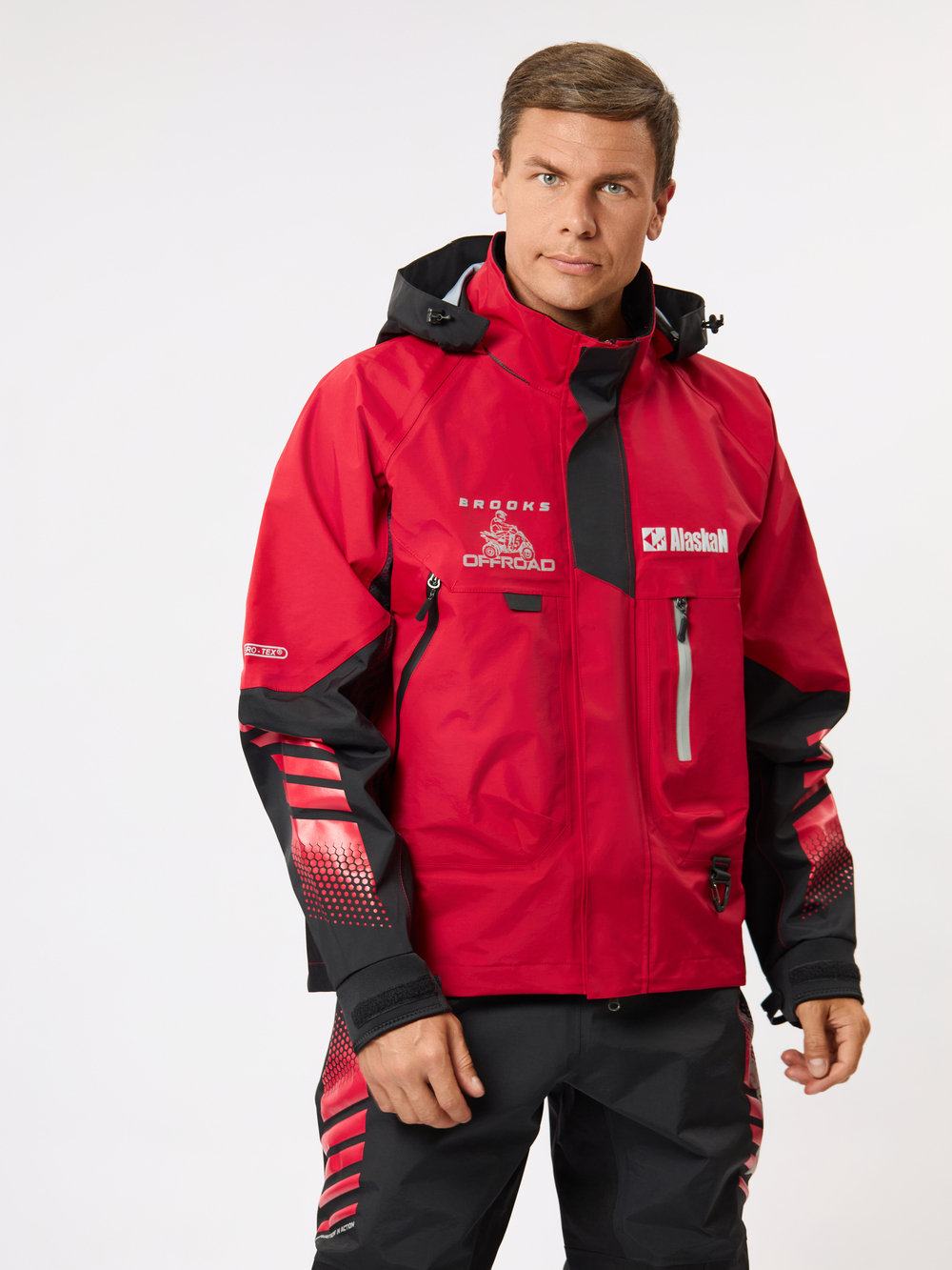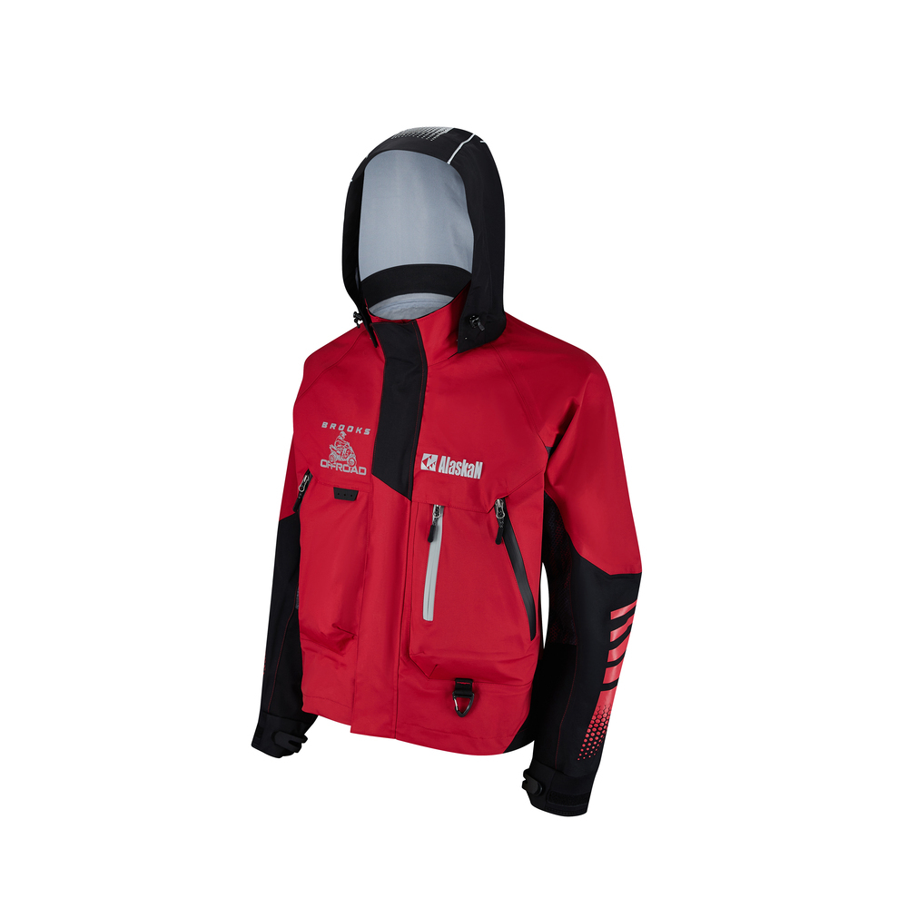Технологии: \rДышащая мембрана AERO-TEX 3 и 5 слоёв\rПропитка DWR\rСветоотражающие принты\rПроклеенные швы\rАртикулированные 3D рукава\r\rМембранная куртка Alaskan BROOKS разработана как для забродной рыбалки, так и для катания на квадроцикле. Удобная и прочная модель имеет анатомический крой, который обеспечивает свободу движений. Красный цвет и принты создают спортивный и привлекательный внешний вид. Куртка изготовлена из трехслойной и пятислойной современной мембранной ткани AERO-TEX, эффективной и долговечной, а пропитка DWR обеспечивает дополнительную защиту от воды и грязи. Куртка имеет убирающийся в воротник капюшон, а также регулируемые неопреновые манжеты, защищающие от воды. \r\r• Водонепроницаемость: 20000 mm (H2O).\r• Дышащая способность: 10000 gr/m2/24h.\r• Комбинация 3-х и 5-слойного материала AERO-TEX с пропиткой DWR.\r• Брызгозащитные молнии.\r• Удобные регулировки капюшона по высоте и объему.\r• Специальная водонепроницаемая регулируемая конструкция манжет.\r• 2 функциональных кармана для коробок, подлесков и т.д.\r• Перекрёстная планка на застежках "Велкро" (липучка).\r• 1 карман на брызгозащитной молнии для «мелочей».\r• 1 внутренний непромокаемый карман для ключей или документов.\r• 1 карабин для крепления аксессуаров и 2 полукольца со стороны изнанки для крепления чеки.\r• Светоотражающие принты.