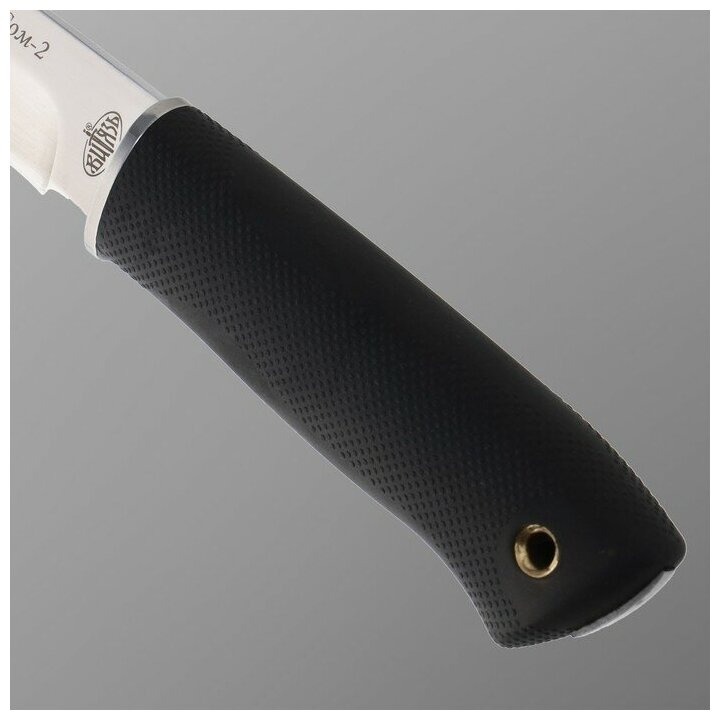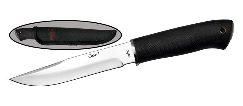 «Сом-2» - универсальный походный нож. Клинок с небольшим понижением линии обуха прекрасно выполняет любую работу на охоте, рыбалке. в походе. Высококачественная сталь хорошо держит заточку, эффективно сопротивляется агрессивному воздействию среды. Пята клинка не заточена, чтобы на нее можно было перенести указательный палец и еще больше повысить маневренность клинка для выполнения тонких и сложных действий. Прочная рукоять из хорошей резины обеспечивает удобный и надежный хват