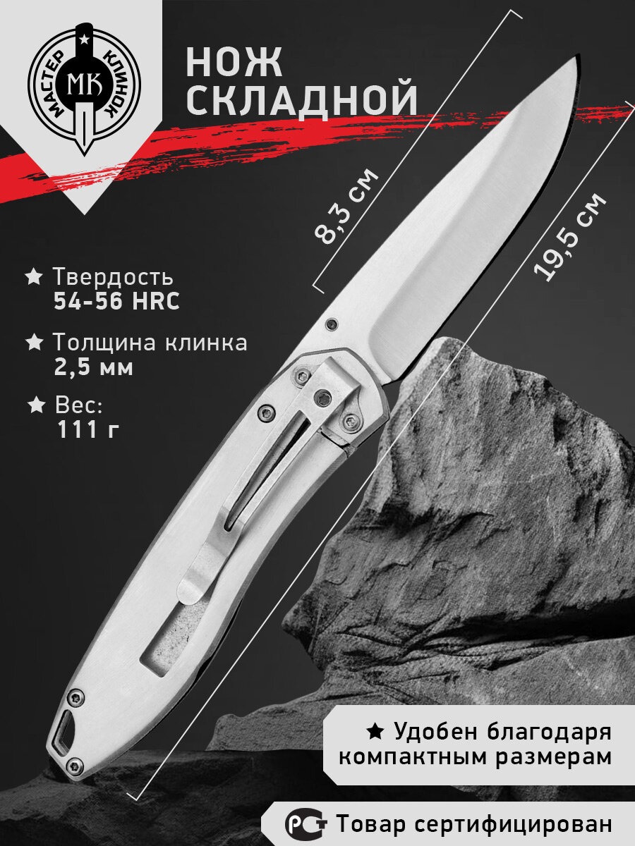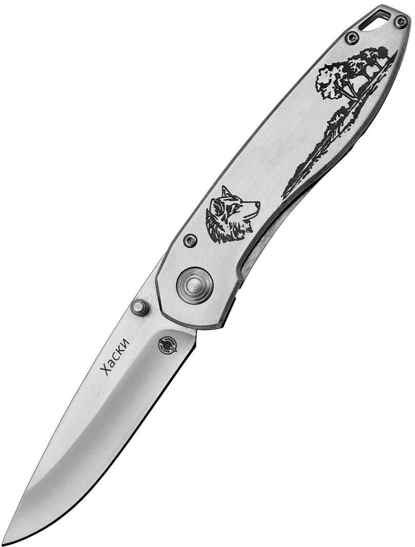 Складной городской нож с изображением собаки и леса на рукояти. Клинок ножа, типа «clip point», изготовлен из высоколегированной нержавеющей стали, закаленный до 54 HRC. Нож хорошо держит заточку, активно сопротивляется коррозии и, вместе с тем, легко точится. Высокие вогнутые спуски обеспечивают прекрасные режущие свойства. Для извлечения клинка используется односторонний шпенек, а безопасность работы обеспечивает надежный замок «frame lock». Рукоять ножа также изготовлена из нержавеющей стали, на которую нанесено изображение методом травления. Для удобства использования на рукояти имеется темлячное отверстие, а удобство ношения обеспечивает жесткая и удобная клипса.