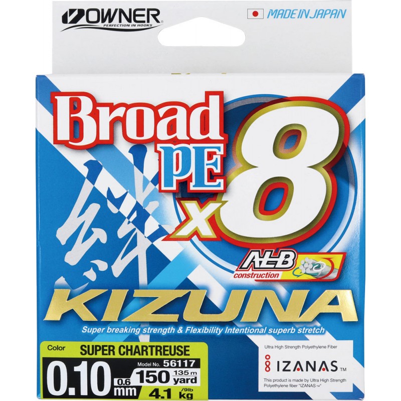 К сезону 2020 года компания Owner представила плетеный шнур высочайшего качества – Kizuna Broad PE x8. Инновационная технология плетения Anti Loosen Braided Construction позволила достичь невероятно гладкой поверхности и минимального сопротивления шнура во время заброса. Чрезвычайно прочные микроволокна Izanas обеспечили шнуру Owner Kizuna Broad PE x8 повышенную устойчивость к истиранию и деформации. Также уменьшился его вес, что положительно повлияло не только на дальность, но и на точность заброса. Передовая технология плетения ALB из 8 микроволокон сделала этот шнур универсальным: он может использоваться как в спиннинговой, так и в морской ловле. Широкий диапазон диаметров позволяет легко подобрать Kizuna Broad x8 под ваши условия ловли. Выпускается в размотках 135, 150, 300 метров и нескольких цветовых решениях. Характеристики:- Высочайшее качество материала Izanas PE- Уникальная технология восьмижильного плетения- Круглое сечение- Самый высокий показатель прочности на узлах и износоустойчивости- Увеличение дальности заброса- Долговечность- Экологически чистый продукт: при сжигании вредные вещества не выделяются- 100% сделано в Японии