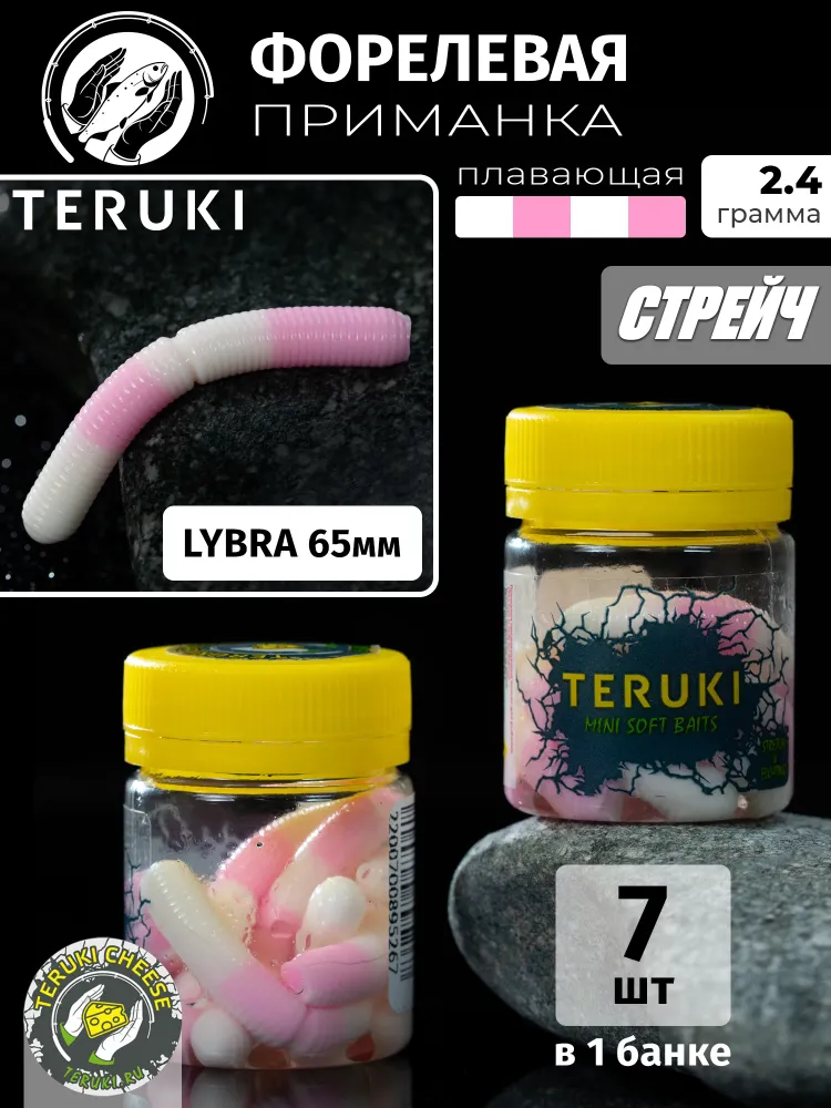 Силиконовые приманки Teruki Lybra 65 миллиметров отличаются превосходными характеристиками, позволяющими успешно ловить рыбу даже в сложных условиях, как в летний, так и в зимний периоды. Набор из 7 наживок в банке станет отличным помощником для любителей рыбалки, обеспечивая максимальную эффективность на водоемах. Плавающая резина Teruki Lybra Floating Stretch 65 мм и весом 2,4 грамма обеспечивает реалистичное движение в воде, что привлекает внимание форели и всей хищной рыбы. Форелевая приманка Теруки Либра сделана из съедобного материала с добавлением в его состав вкусовой добавки сыр, что делает эту насадку очень эффективной при ловле форели на коммерческих водоемах и не только. Приманка максимально эффективна в период сниженной активности хищника и особенно в зимнее время года на платных водоёмах. Универсальный дизайн позволяет использовать её как в пресной, так и в соленой воде, что увеличивает ваши шансы на успешный улов. Приманка подходит для различных джиговых оснасток и легко комбинируется с другими элементами рыболовного снаряжения и монтажами. Все приманки обработаны специальным составом, возбуждающим у рыбы аппетит даже в самое бесклёвье. Поклевок на эти приманки в разы больше, чем на другие аналоги. Приманки от компании Teruki отлично подходят для целенаправленной ловли на спиннинг форели, щуки, судака, окуня, жереха, голавля, язя. Разработана и сделана спортсменами по итогам большого количества тестов и проб на разных водоемах и соревнованиях. Их можно хранить в одной емкости, при этом они не будут слипаться или красить друг друга, и каждая сохранит свой уникальный цвет. Либра 65мм прекрасно ловит прудовую форель на коммерческих водоемах на активные снасти (спиннинг летом, бомбарды, зимняя удочка, пассивные монтажи), а так же для ловли форели в диких и горных реках. Она прекрасно подходит для поплавочных, донных удочек и фидеров, обеспечивая надежное крепление на крючке. Этот набор приманок — отличный выбор для тех, кто хочет иметь под рукой всё необходимое для результативной рыбалки. Очень эластичный и одновременно упругий материал, воспринимается рыбой как нечто живое, поэтому количество холостых поклевок стремится к нулю. Наши силиконовые приманки для ловли хищных и мирных рыб обладают съедобными свойствами благодаря активным аттрактантам, которые входят в состав стрейч силикона. Благодаря этому они очень эффективны и часто помогают в периоды низкой активности рыбы. Не упустите возможность испытать результативность этой приманки на своей следующей рыбалке. Применяйте её с разнообразными способами проводки, чтобы узнать, какой вариант наиболее привлекательный для форели. Эта приманка порадует вас не только своим качеством, но и способностью привлекать рыбу в любую погоду и время года.